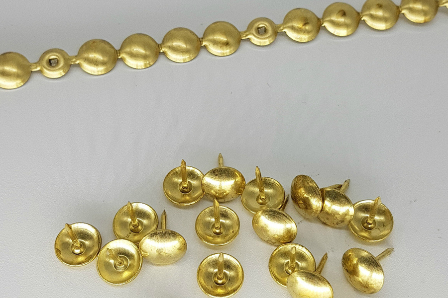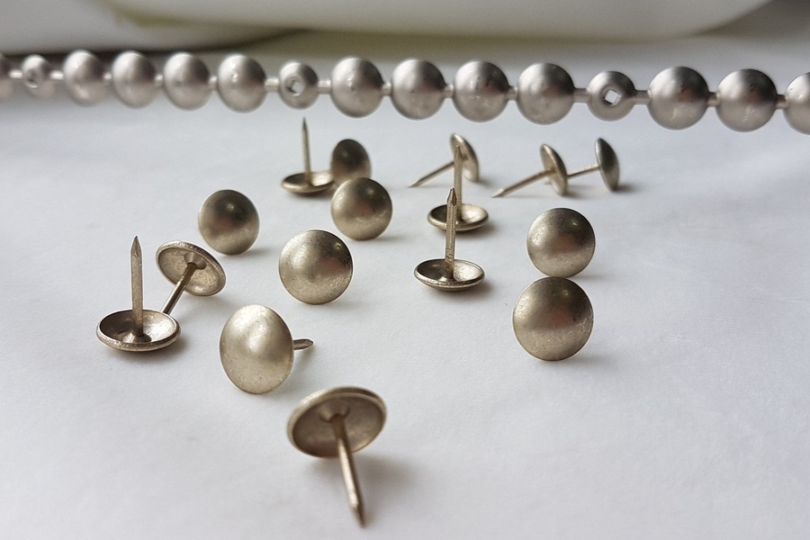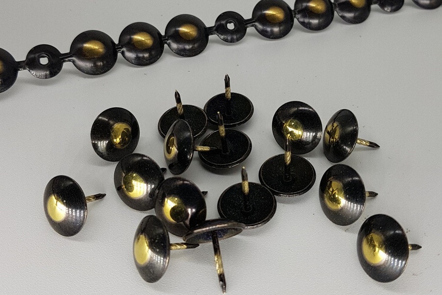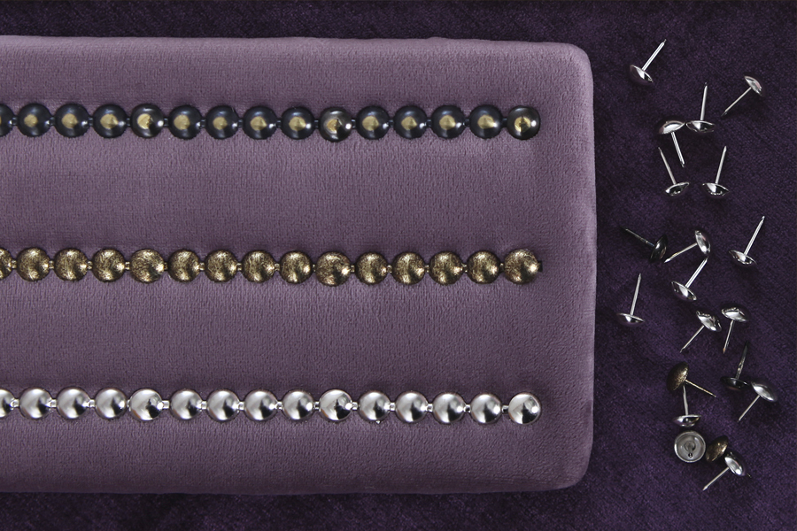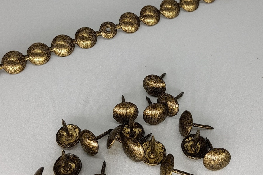 Молдинг для мягкой мебели представляет собой планку из шляпок гвоздиков, с помощью которой можно легко и красиво изменить внешний вид дивана или кресла. Цвета молдинга могут быть разные: состареное золото, серебро или античная бронза. Они отлично дополняют мебель в классической кожаной и текстильный обивке. Молдинг легко гнется, повторяя формы мебели, и надежно крепится при помощи специальных гвоздиков.